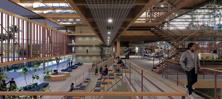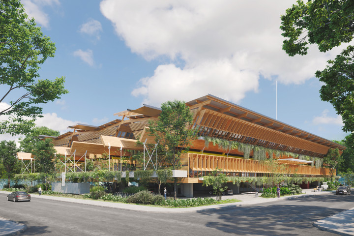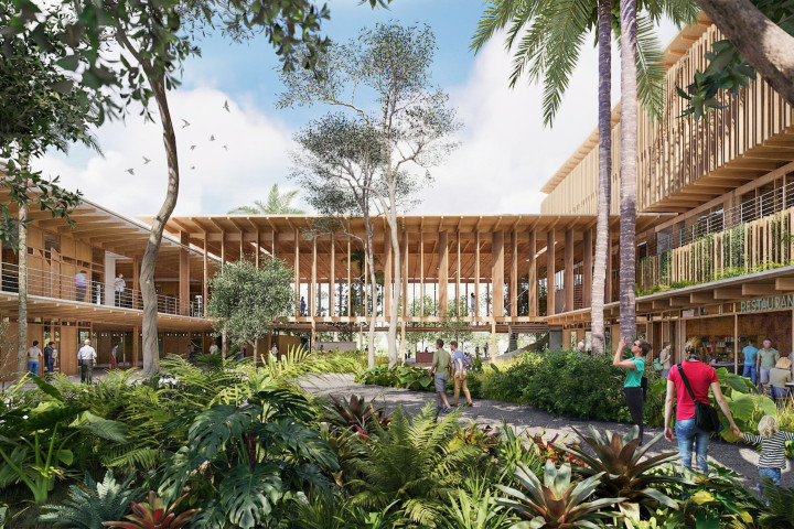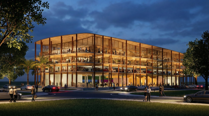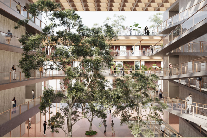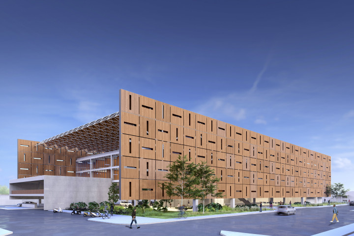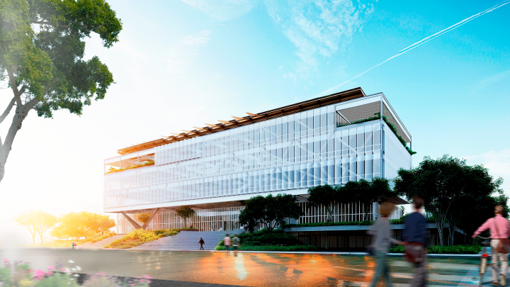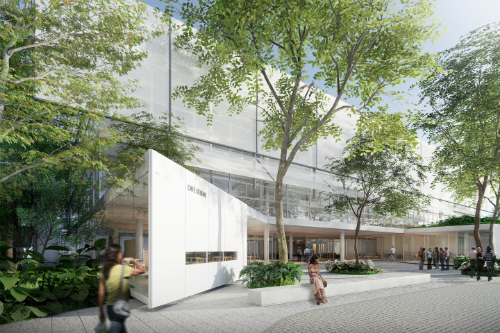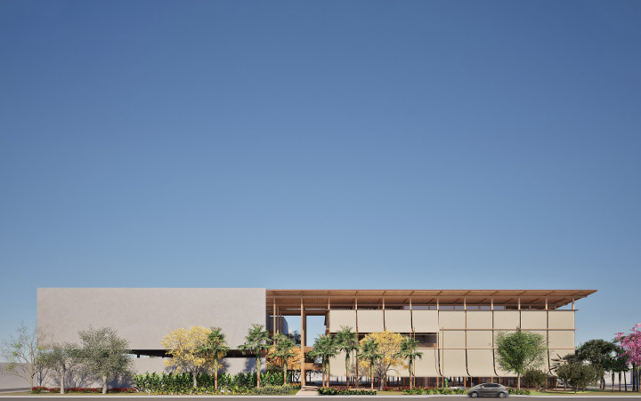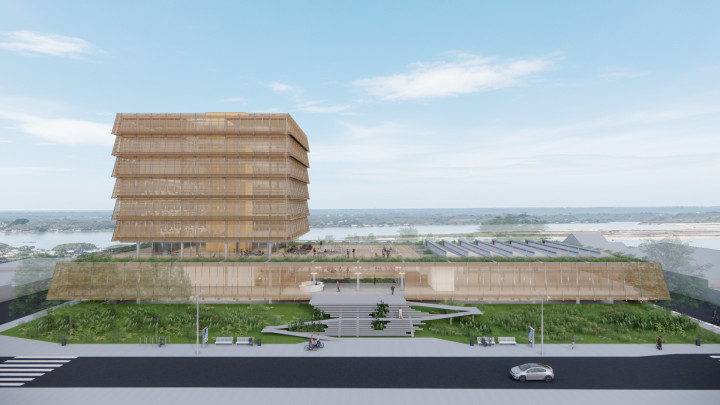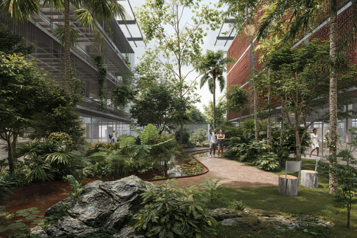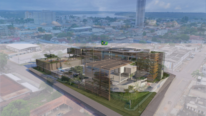 A proposta tem como premissa a preservação da vegetação existente e sua integração ao passeio público da cidade, além da criação de espaços arborizados na praça coberta, com espécies nativas da Amazônia. Os canteiros das calçadas e a praça interna do pavimento térreo serão configurados como jardins de chuva, que integram as soluções baseadas na natureza do projeto. O espelho d’água, além da composição paisagística, será também um reservatório para a retenção, o tratamento e o reaproveitamento de águas pluviais. Os jardins internos, das áreas de convivência e descompressão, contribuem para o conforto ambiental dos espaços internos. O terraço-jardim, além de espaço de fruição e convívio, contribui para reduzir a emissão de calor e aumentar a inércia térmica da edificação, cujas soluções habilitam o projeto para a obtenção da certificação LEED (Platinum) e PBE EDIFICA (RTQ-C / ENCE Classe A).