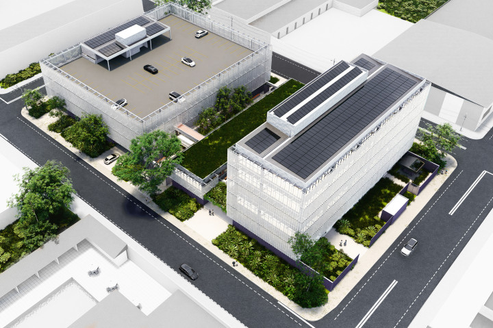 Intercalação de volumes conforme orientação solar: A volumetria se resolve em três pavimentos. Os dois primeiros, orientados Leste-Oeste, posicionam o volume do estacionamento como barreira solar a Oeste. As áreas de trabalho concentram-se no terceiro pavimento, orientado Norte-Sul.