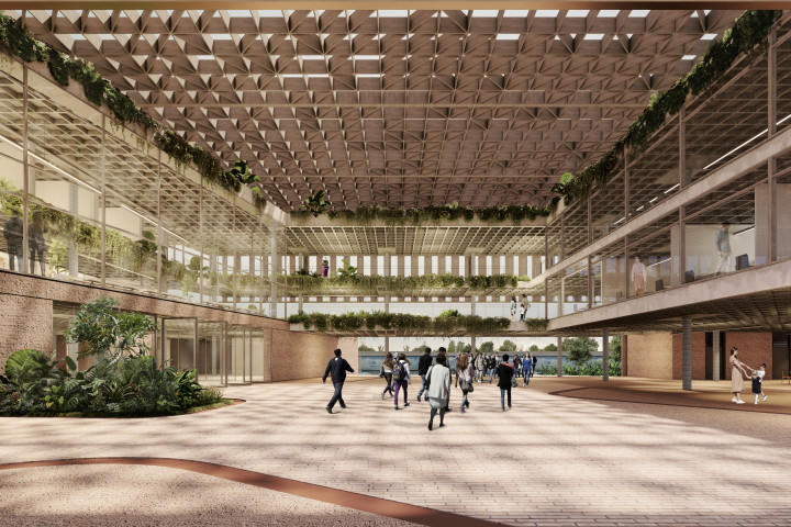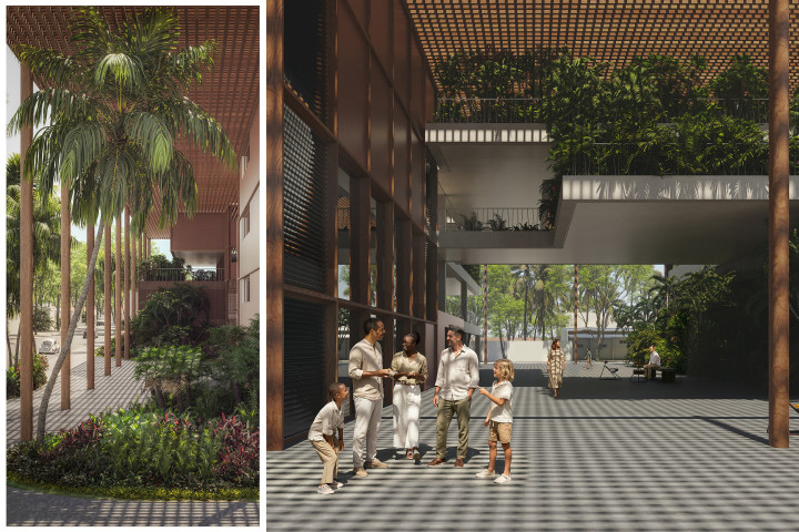 Hall de acesso como articulador: Concebido como um atravessamento longitudinal do lote, este espaço garante acesso universal a partir de todas as ruas e uma recepção unificada. Oferece clareza de circulação e leitura facilitada dos setores.