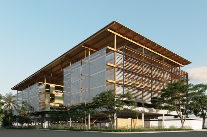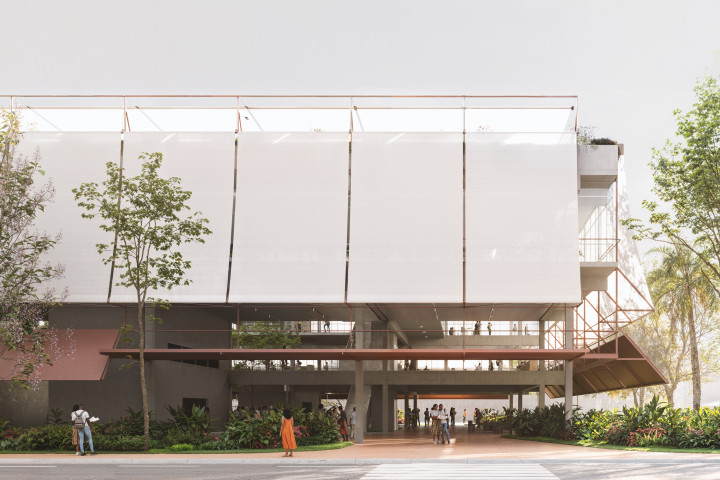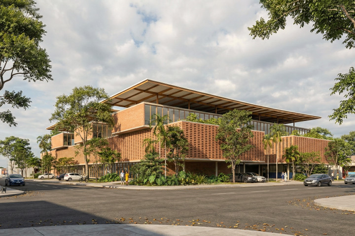 Cobertura unificadora e fachada vazada: Uma grande cobertura com beirais generosos e fachadas vazadas protegem os volumes. Esta estratégia permite livre circulação de ar, criando um edifício “respirável” com ventilação cruzada que reduz a necessidade de climatização artificial. Também protege contra radiação solar e chuvas, diminuindo custos de manutenção.